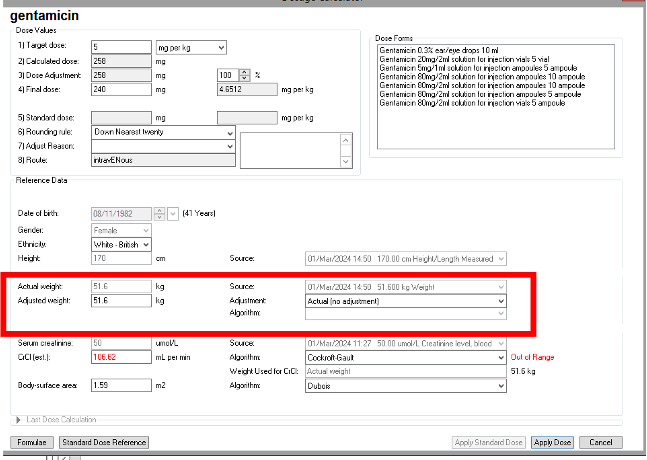 The EPR gentamicin calculator will launch automatically when gentamicin is prescribed. This calculator will calculate the dosing weight. In order to do this, an accurate weight and height will need to be entered on EPR. This calculator will calculate a dose and rounds down to the nearest 20mg. This calculator is capped with a maximum dose of 480mg.