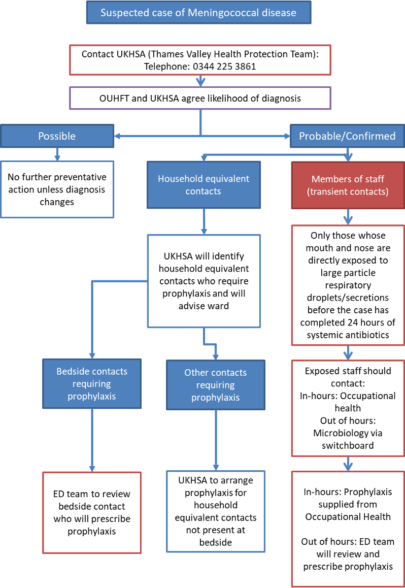 2.1. Health protection staff (UKHSA) will risk assess the relatives and close contacts of a patient with (probable or confirmed) meningococcal infection. They will also provide advice on antibiotics. OUHFT will only supply chemoprophylaxis for household equivalent contacts identified by UKHSA where it is felt to be inappropriate to send the contact to obtain chemoprophylaxis in the community (e.g. parents or partner of critically ill patient who wish to remain at their bedside).