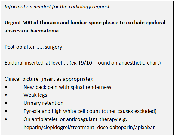 Contact the oncall radiology consultant. If there is a contraindication to MRI, discuss with the radiologist what might be a reliable alternative to exclude an epidural abscess/haematoma.