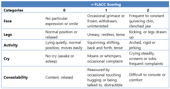 The r-FLACC scale (revised Face, Legs, Activity, Cry, Consolability scale) is useful for children or for adults unable to communicate their pain. It comprises 5 categories each scored as 0-2 to give an overall score of 0 (no pain) – 10 (most pain).