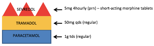 Ensure regular pain assessment ( Basic Principles). Morphine doses can be cautiously increased as tolerated if pain is not well controlled. Consider stopping tramadol and prescribing regular sevredol QDS, in addition to PRN sevredol, if constant, background pain, is poorly controlled. The regular sevredol will be easier to titrate than modified-release morphine (eg MST) which should be avoided.