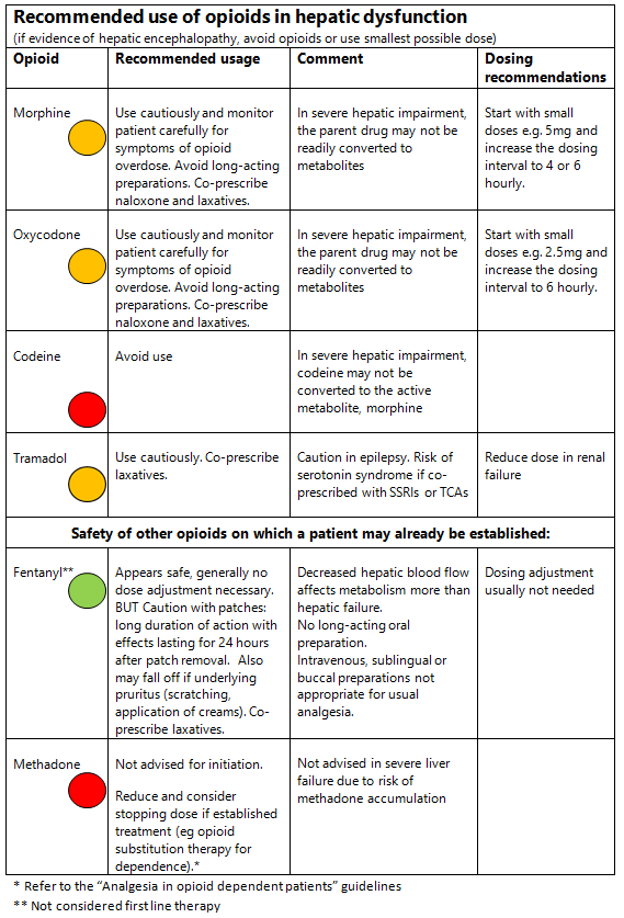 Recommended initial analgesic prescribing for moderate to severe hepatic failure